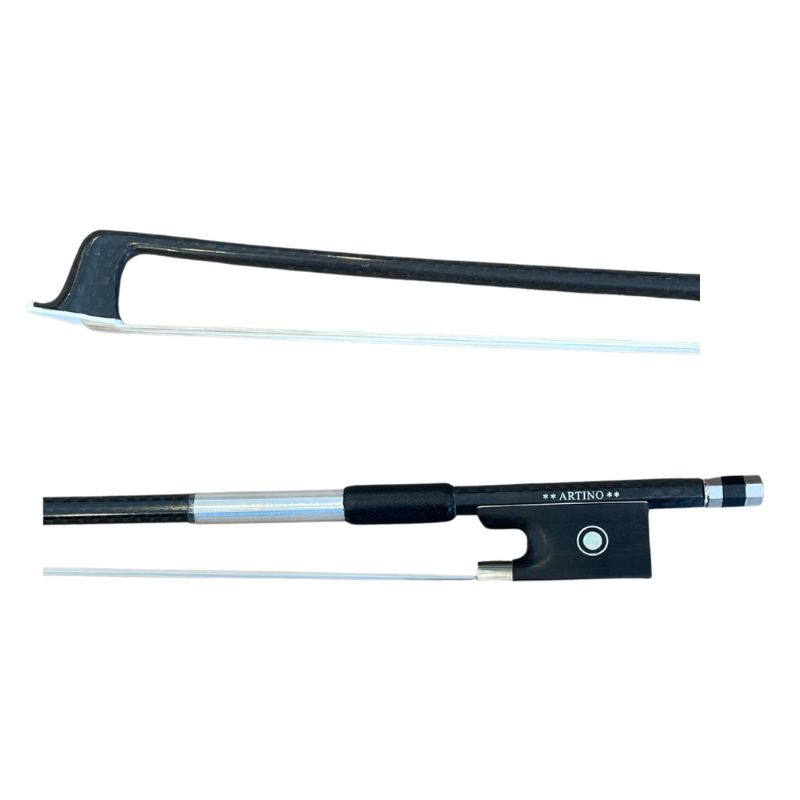 Artino Premium quality carbon fiber violin bow with woven patter in semi glassy finish. Nickel silver windings/mountings, full-lined better quality ebony frog with Parisian eyes with real horsehair, 4/4 size.