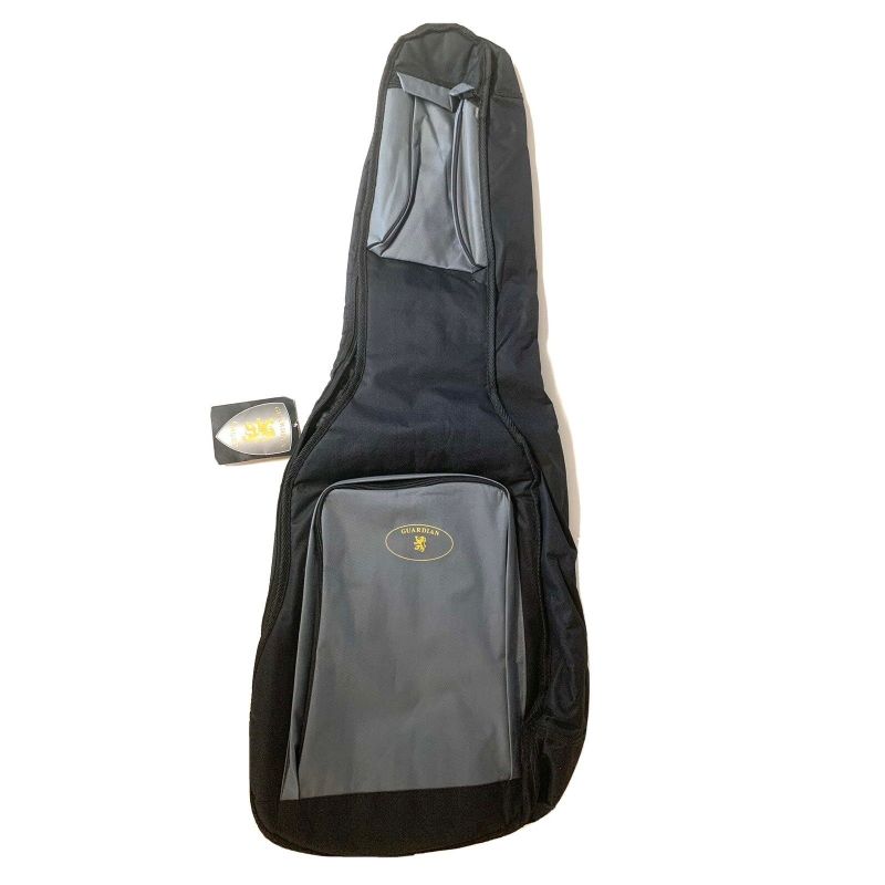 Guardian Padded Guitar Gig Bag, Black and Grey. Fits Dreadnaught Acoustic Guitar. Has a large zippered pocket. Small pouch pocket on neck, back pack straps for carrying and side handles. 5mm padding.
