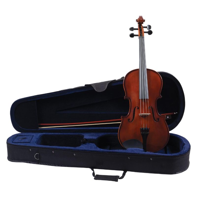 Student Viola Outfit, hand carved, inlaid purfling, ebony trim, gold-brown varnish. Outfit includes a shaped case with cordura cover, wood bow with Mongolian horse hair and ebony frog. 15" size.