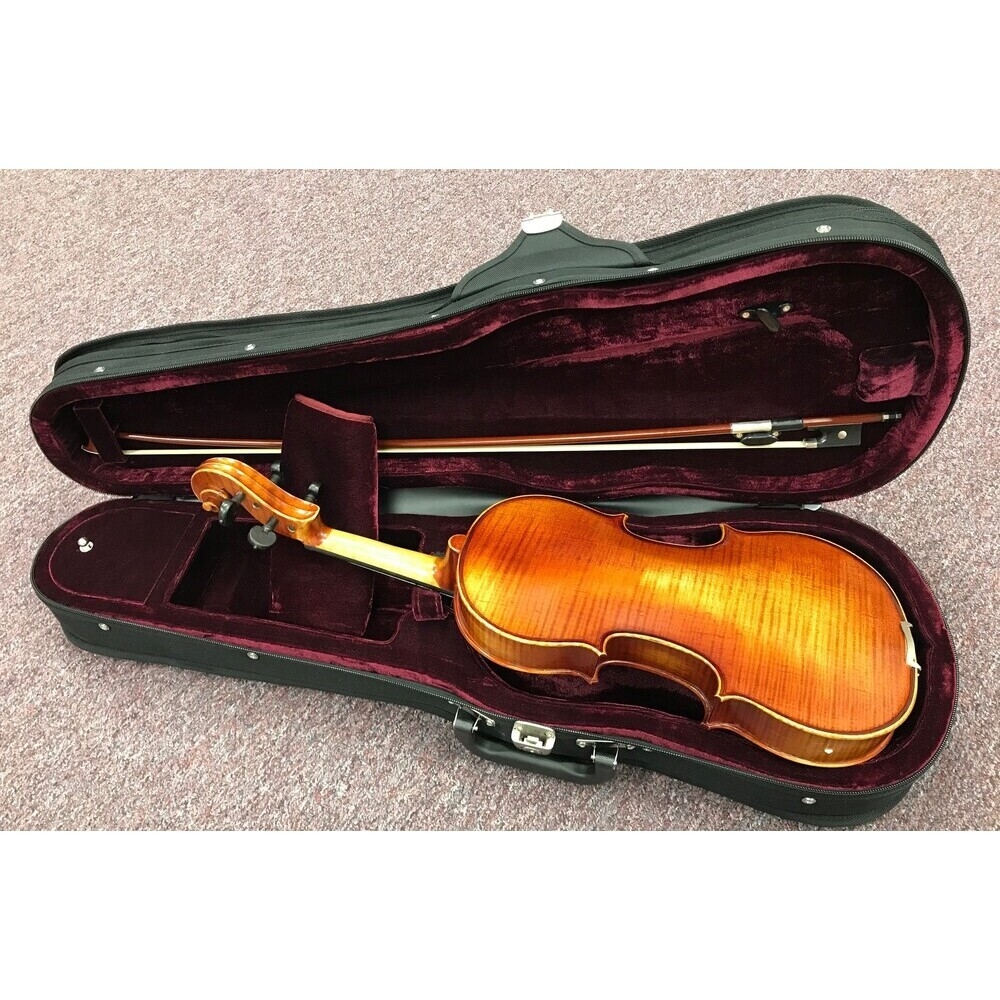 The Regale Violin Outfit offers the intermediate student an instrument that has the workmanship and sound of a fine European violin at an affordable price. Features include a tightly grained spruce top, well flamed One Piece Maple Back, neck and sides, ebony heart shaped pegs, ebony fingerboard, nut and saddle, Hill style tailpiece, Guarnerius chinrest and endpin. the hand rubbed varnish is red brown with a beautiful undertone. Every violin is shop adjusted by a professional luthier. The outfit also includes a wood constructed shaped case with cordura cover, Brazilwood bow with ebony frog and real horsehair.