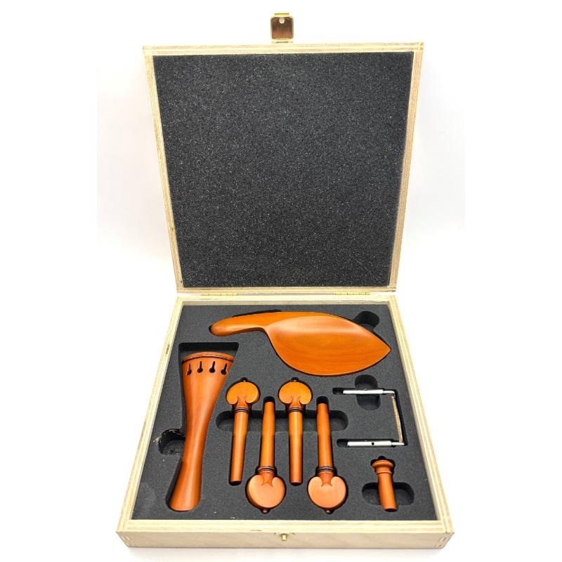 Guardelli Fine Violin Fitting Accessory Set made of Boxwood with Tintil Trim. Guardelli Pro Quality Accessory sets are designed for high end instruments. Made from quality well seasoned woods to insure stability, tone and durability. Each set features: Heart Shaped Pegs with a diameter of 8.9mm, Round Tailpiece with a length of 113.5mm, Petite Guarneri Model Chinrest with Titanium Clamps and an Endpin with a ring and ball. Each polished accessory set is packaged in a wooden box.