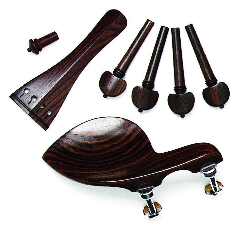 Rosewood with black trim. The set includes a set of Hill style pegs with black collar and pin. Matching Guarnerius style chinrest with Hill style clamps. Hill style tailpiece with black fret and endpin with black pin.