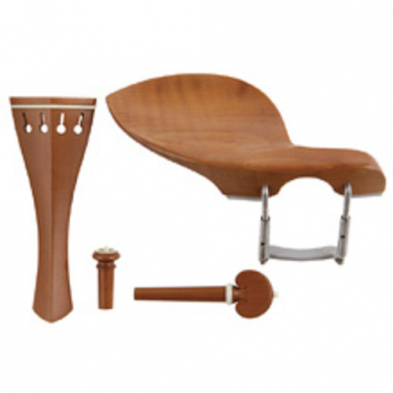 Violin Accessory Set includes 4 heart shaped pegs, decorative endpin, English model tailpiece and a Guarneri chinrest with stainless steel U clamps, boxwood with white decorative trim.