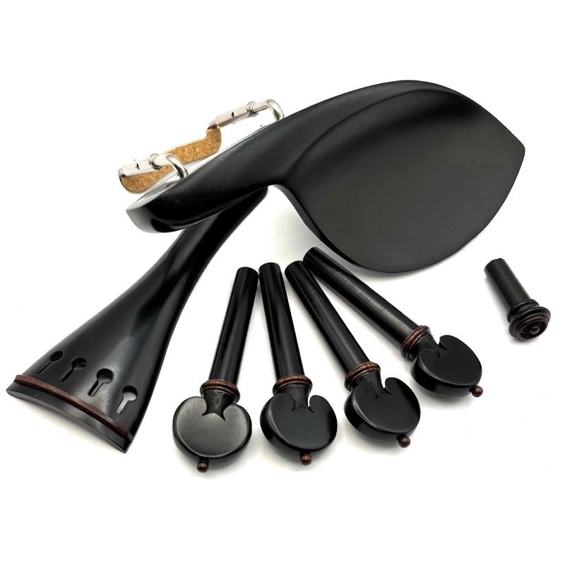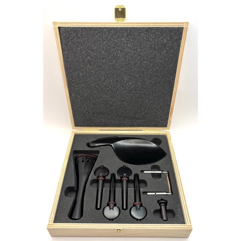 Guardelli Fine Violin Accessory Fitting Set made of Ebony with Tintil Trim. Guardelli Pro Quality Accessory sets are designed for high end instruments. Made from quality well seasoned woods to insure stability, tone and durability. Each set features: Heart Shaped Pegs with a diameter of 8.9mm, Round Tailpiece with a length of 113.5mm, Petite Guarneri Model Chinrest with Titanium Clamps and an Endpin with a ring and ball. Each polished accessory set is packaged in a wooden box.
