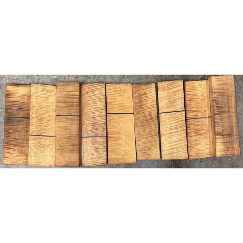 One 2-piece Violin Back with Sides, Old European Maple. Photo is a group photo and just a representation of the wood. Photo is just a representation of the wood. Each piece will vary in appearance. Approximate Dimension 15 ½” x 4 ¾” . 18mm thick at center. Some backs are larger, but not smaller.