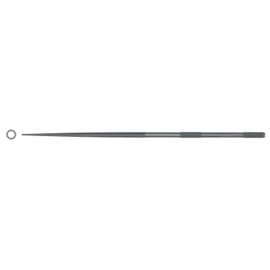 Grobet USA 10cm Round Needle File, Cut 0. 100mm total length, cutting length 50mm, thinnest 0.5mm, thickest 2.2mm. Grobet USA Swiss Pattern Needle Files are precision files, for exacting work, especially under magnification. Made of the highest quality steel, machined and finished for precision shape, accuracy and balance. Handles are knurled. Overall length 4" (100 mm), Width 3/32" (2.2 mm)