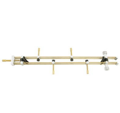 The movable clamping jaw (1) can be easily set to the desired length. The clamping pad (2) is concave on one side and convex on the other and pivots to accommodate the exact contours of the instrument. The sliding jack screws (3) allow the crack to be leveled without the use of additional wedges. The double brass rods (4) are flexible and can be shaped to conform to the curvature of the instrument being restored. Brass jack screws with rubber padded plates. Clamping pads and thumbscrews made of aluminium. Crack clamps with rubber jaws minimize slipping and possible damages to the fine edgework of the instruments. The use of rubber jaws makes this tool safe and even more usable for all precise restoration purposes., Material Brass, Aluminium, Instrument Violin, Viola, Jaw opening 280 mm.
