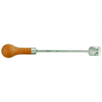 Fine grooving spoon gouge, with extended neck and slightly bend blade for concave surfaces, such as violin tops and backs. Pfeil Swiss precision tools, shaft and blade forged from a single piece of steel, fine finish, polished. With bent blades for shaping the tops and backs of stringed instruments. Inside bevels, boxwood handles. The shaft and blade are forged from a single piece, finely ground and polished. Width 30mm, overall length 310mm.