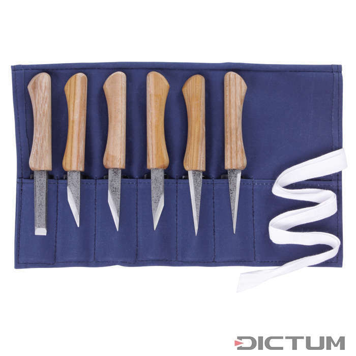 Double layered knives with different bevels.Comes pre-sharpened, with hollow-ground back for easy resharpening, in a cotton tool roll. Ash Handle, knives consist from 2 layers of carbon steel. The lower cutting layer is hardened to 58 HRC, the upper softer layer secures the stability of the blade and enable easy resharpening. Blade length 60mm, width 13mm overall length 155mm. Bevels are Left 25, right 25, left 12, right 12, both 25 and 90 degrees.