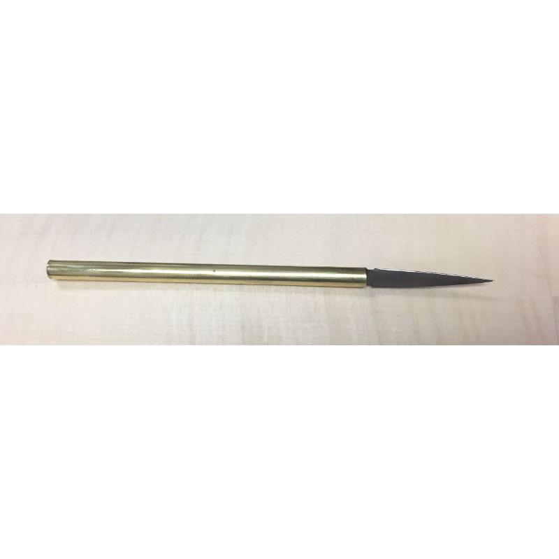 Violin Makers Knife in a brass round handle. 7mm blade with a 35 degree bevel is permanently set within a brass 8mm round handle. The blade is made of high speed steel and is double beveled. The blade will require fine sharpening before use. Ideal for bridge and F-Hole cutting.