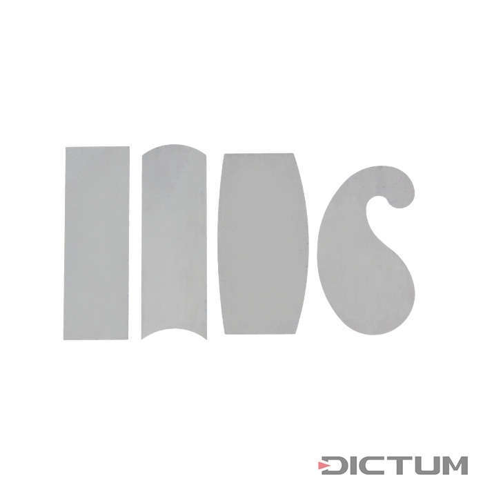 4 Piece Scraper Set. 1 each, rectangular 150 x 50mm, convex/concave 140 x 50mm, ballshaped 140 x 70 mm, gooseneck 130 x 70 mm Thickness is 0.40mm