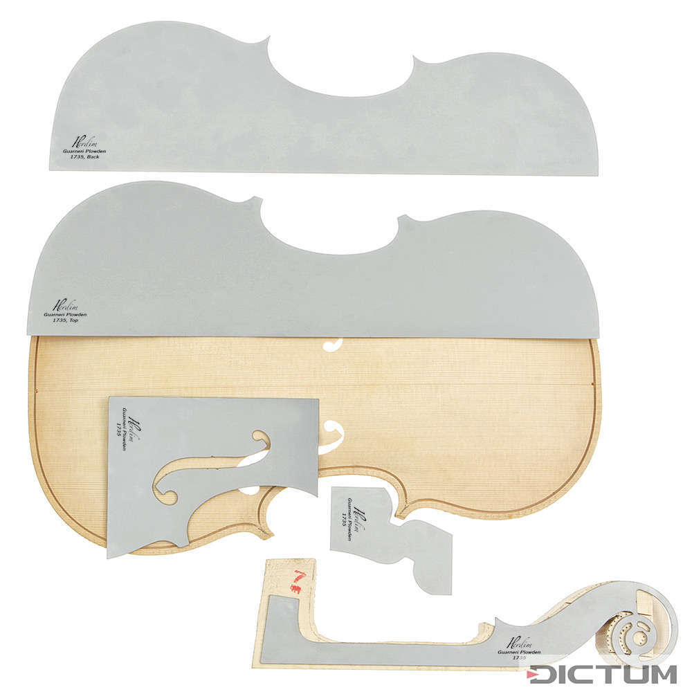 Herdim Outline Templates, 5 piece Set - The set contains all necessary templates for plate outline, neck (scroll) template, f-hole template including the f-hole position and an outer corner form for detailed control on corner details. Thickness 1mm.VIOLA15.5" Strad Axelrod 1695 model.
