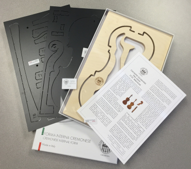 Giuseppe Guarneri Del Gesu 1733 Kreisler Violin Deluxe Mold and Template Set. This Deluxe set includes an inside mold that is 15mm thick made of 11 ply wood. The set contains all templates for plate outline, neck (scroll) template, f-hole template including the f-hole position, upper and lower blocks, corner blocks and complete arching templates for top and back. Also included is a brief history of the maker and model with a color photo. First time available! Made in Italy.